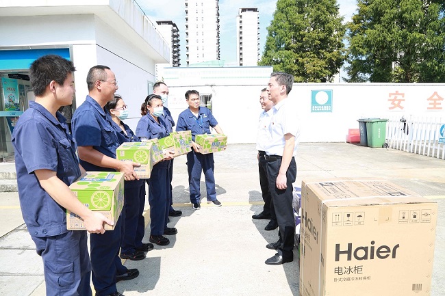 為切實做好夏季防暑降溫工作,保障高溫期間全體職工的身體健康,確保生產(chǎn)經(jīng)營工作順利進(jìn)行,8月11日下午,安慶港華常務(wù)副總楊善俊、工會主席韓高中一行來到港華路加氣站、雙井街路段戶內(nèi)管外移作業(yè)現(xiàn)場及北部新城調(diào)峰站等處,看望慰問高溫下始終堅守在一線崗位的燃?xì)夤ぷ髡撸⑺腿ダ涔?、飲用水和防暑降溫用品,把公司的關(guān)懷送到職工們的心坎里。