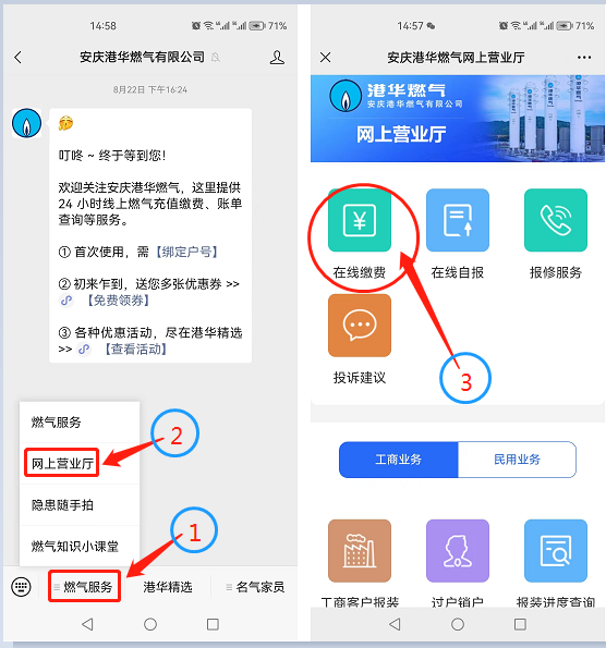 微信公眾號:關(guān)注我公司微信公眾號“安慶港華燃氣有限公司”,點擊“燃氣服務”-“網(wǎng)上營業(yè)廳”,在網(wǎng)上營業(yè)廳中選擇“在線繳費”,即可繳納燃氣費或者預存氣費。