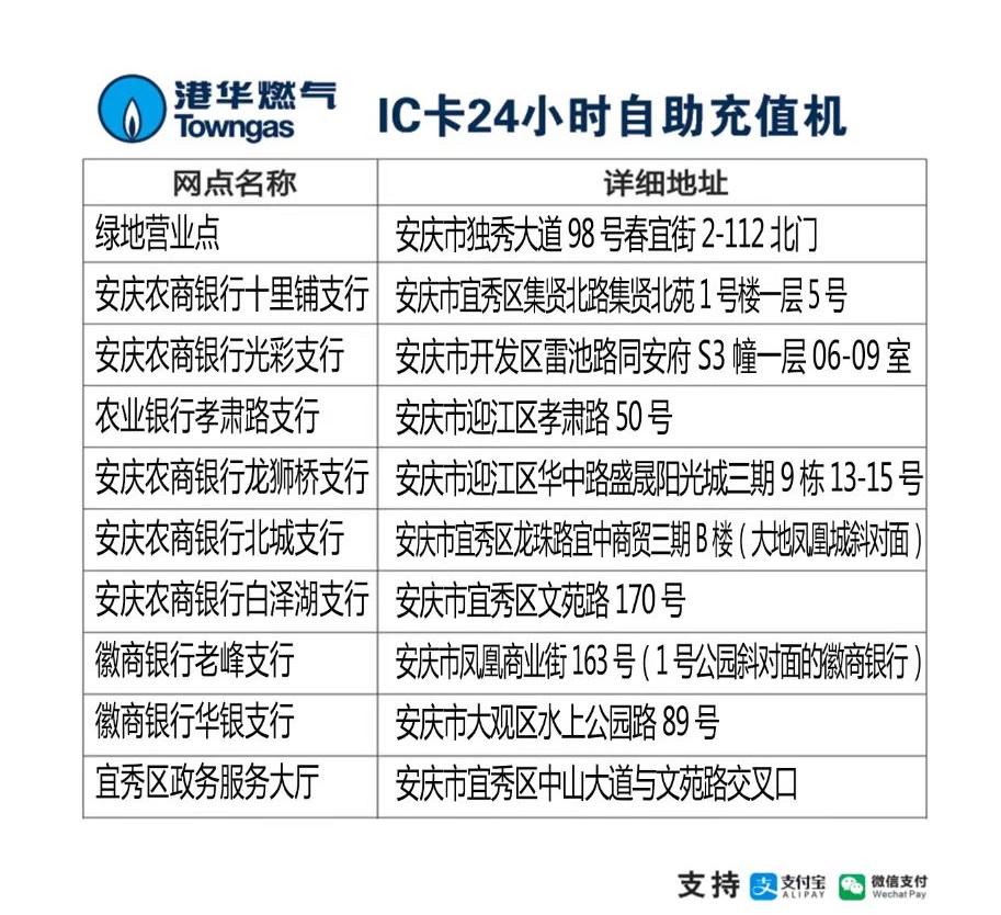 目前我公司支持交通銀行、徽商銀行、郵政儲蓄銀行、工商銀行、農(nóng)業(yè)銀行和浦發(fā)銀行的網(wǎng)上銀行和手機銀行,以及移動“中國移動”、電信“翼支付”、我公司微信公眾號和在“微信”-“生活繳費”、“支付寶”-“生活繳費”中查詢?nèi)細赓M并繳納欠費或預存氣費。