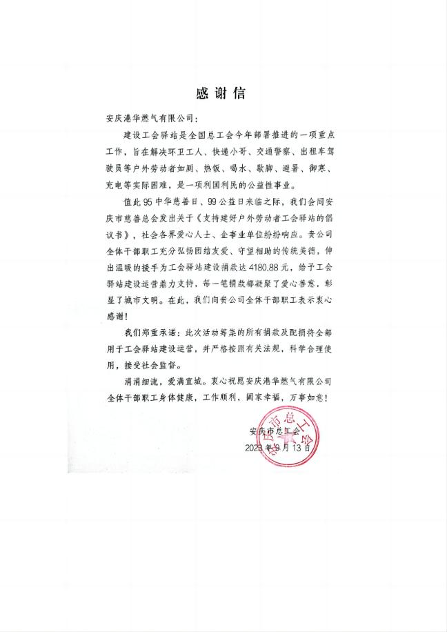 為進(jìn)一步傳播慈善文化,弘揚(yáng)傳統(tǒng)美德,推動(dòng)戶外勞動(dòng)者工會(huì)驛站建設(shè)。在全國第八個(gè)“中華慈善日”來臨之際,安慶港華高度重視,認(rèn)真部署,依法組織,在公司開展“慈善日捐款”活動(dòng)。