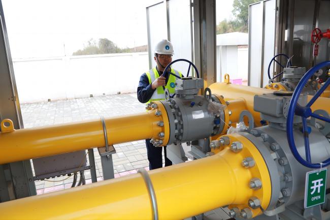 12時(shí)08分,置換作業(yè)開始。確定管道內(nèi)氣體成分比例符合要求后,置換組緩慢開啟1號(hào)閥門,向管網(wǎng)內(nèi)輸送天然氣,并由調(diào)度中心對(duì)管網(wǎng)內(nèi)壓力情況跟進(jìn)、監(jiān)測。正午時(shí)分,驕陽似火,檢測人員們一邊吃著盒飯一邊堅(jiān)守施工現(xiàn)場觀測數(shù)據(jù)。終于,14時(shí)16分,現(xiàn)場調(diào)度的對(duì)講機(jī)內(nèi)傳來放散塔檢測人員的聲音:“經(jīng)檢測,管網(wǎng)內(nèi)燃?xì)夂恳堰_(dá)99.7%,置換合格?!?