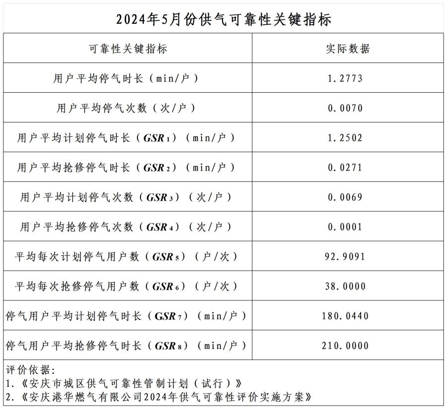 2024年5月供氣可靠性關鍵指標