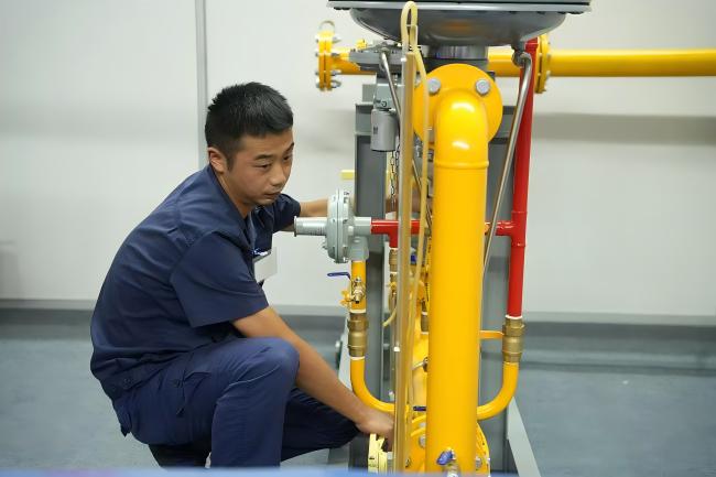 本次競賽分為理論考試和實操競賽兩大部分,內(nèi)容涵蓋技術(shù)方案編制、蒙眼拆裝、工藝系統(tǒng)檢查及故障排除等多項考核內(nèi)容。理論考試主要檢驗參賽選手對燃?xì)夤艿勒{(diào)壓相關(guān)知識的掌握情況,而實操競賽則通過模擬真實工作環(huán)境,全面考察選手的實際操作能力和應(yīng)對突發(fā)情況的能力。在實操競賽中,選手們需要在規(guī)定時間內(nèi)完成蒙眼拆裝切斷閥、排查調(diào)壓器故障并恢復(fù)管道壓力等任務(wù),整個過程需準(zhǔn)確無誤的完成144個零件的拆裝,并一次性調(diào)試合格。比賽現(xiàn)場氣氛緊張而熱烈,選手們?nèi)褙炞?、爭分奪秒,展現(xiàn)了燃?xì)庑袠I(yè)職工良好的職業(yè)素養(yǎng)和團隊協(xié)作精神。