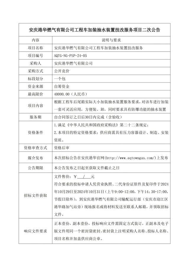 安慶港華燃氣有限公司工程車加裝抽水裝置技改服務(wù)項目二次公告