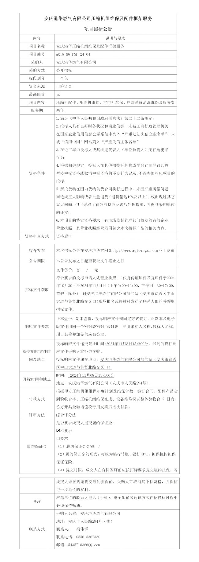 安慶港華燃氣有限公司壓縮機組維保及配件框架服務項目招標公告