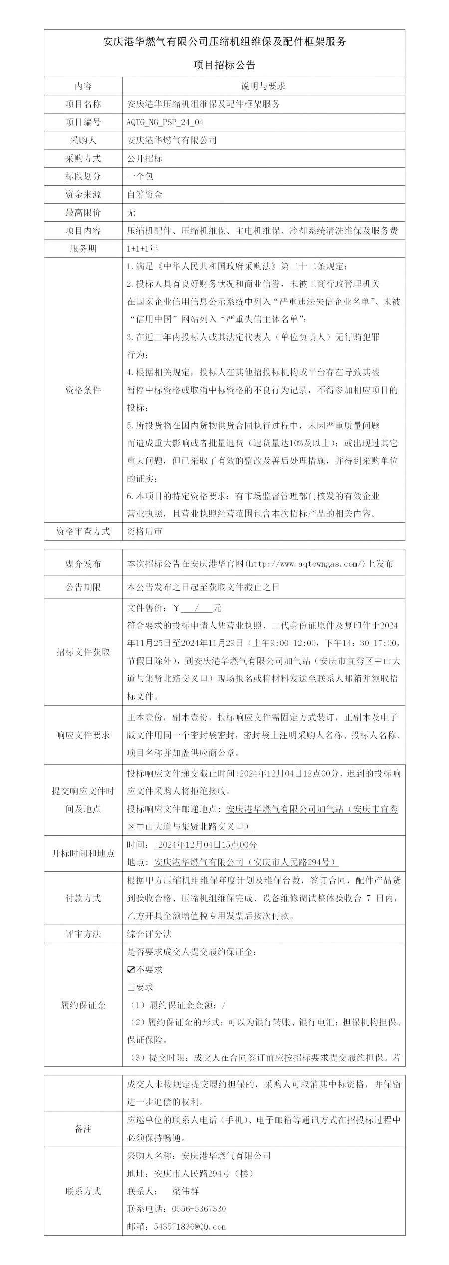安慶港華燃?xì)庥邢薰緣嚎s機(jī)組維保及配件框架服務(wù)項目招標(biāo)公告