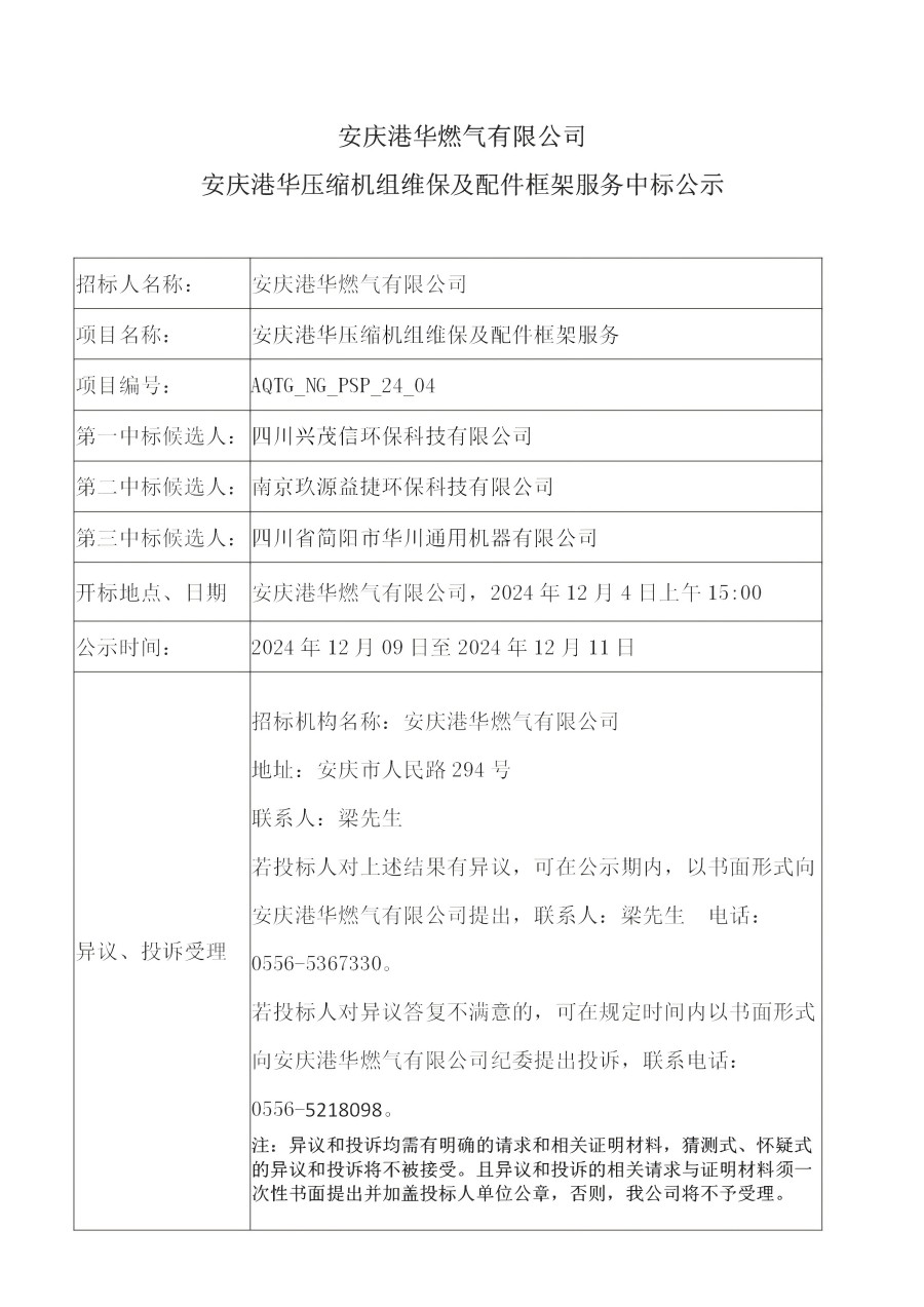 安慶港華燃?xì)庥邢薰景矐c港華壓縮機(jī)組維保及配件框架服務(wù)中標(biāo)公示