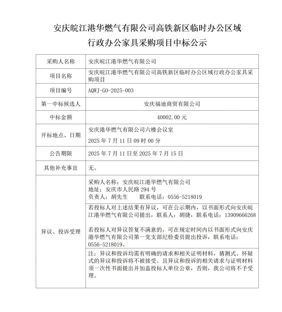 安慶皖江港華燃?xì)庥邢薰靖哞F新區(qū)臨時(shí)辦公區(qū)域行政辦公家具采購(gòu)項(xiàng)目中標(biāo)公示