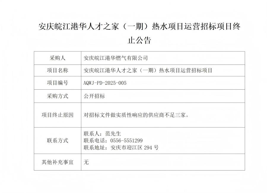安慶皖江港華人才之家(一期)熱水項目運營招標(biāo)項目終止公告